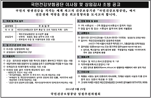 건보공단은 오늘(29일)부터 내달 8일까지 김 이사장 이후 차기 건보공단 수장을 맡을 새 이사장과 상임감사 1명에 대한 공개모집에 나섰다.