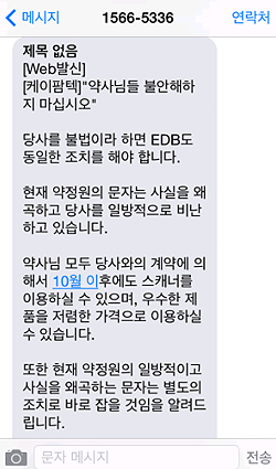 이에 대해 케이팜텍도 스캐너 사용 약국에 문자메시지를 보내 맞불을 놓았다.