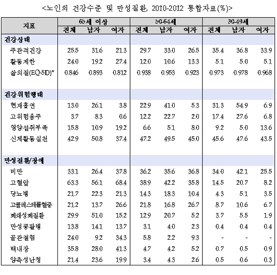 65세 이상 노인의 건강수준 분석결과에서는 건강생활습관은 청장년기에 비해 양호했지만 만성질환과 기능상실로 인해 건강관련 삶의 질은 낮았다.