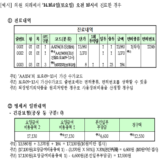 건강보험심사평가원이 예시한 토요일 오전 10시 진료분의 진료내역과 명세서 일반내역은 이렇다.