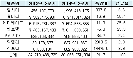 최초의 바이오시밀러인 램시마(셀트리온) 역시 2분기 19억원으로 점유율을 점차 확대해나가고 있다.