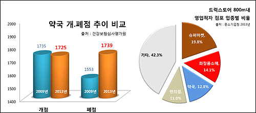 대기업 계열 드럭스토어(일명 헬스앤 뷰티스토어)의 확장이 약국 폐업과 경영 적자에 직접적인 영향을 미치고 있다는 분석자료가 제시됐다.