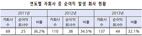 한편 2013년 기준 자회사 137개 전체 매출액은 821억6500만원으로 전년대비 278억9500만원(51.4%) 증가했지만, 전체 자회사 중 순이익이 발생한 자회사 비율은 조사기간(2011~2013년) 평균 34.3%에 불과했다.