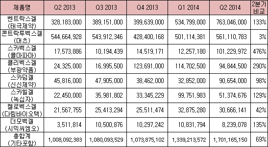 태극제약의 벤트락스겔은 133%나 올랐고, 콜마파마의 스카벡스겔은 476%, 부광약품의 클리벡스겔도 290%로 놀라운 성장률을 보였다.