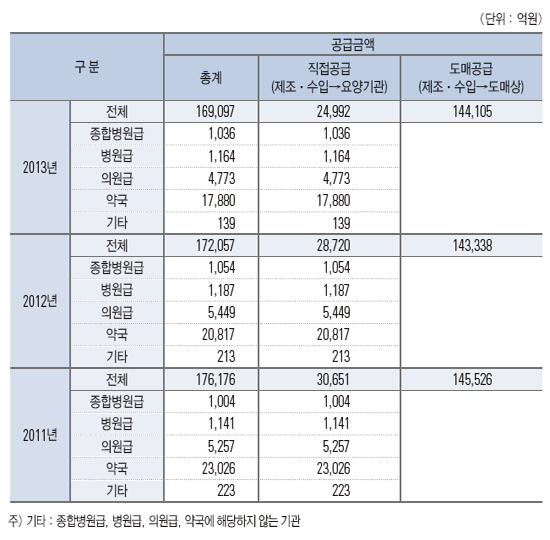 13일 건강보험심사평가원의 '2013 완제의약품 유통정보 통계집'에 따르면 지난해 제약사가 도매업체와 요양기관에 공급한 의약품은 총 16조9097억원 규모였다.