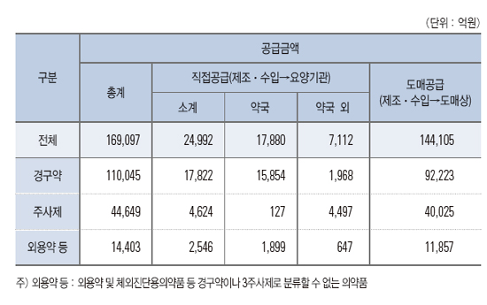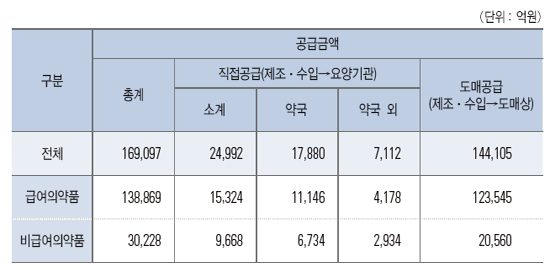 전문의약품과 급여의약품은 특히 대부분 도매를 경유해 공급되고 있었다. 반면 일반의약품과 비급여의약품은 상대적으로 직거래 비중이 높게 나타났다.