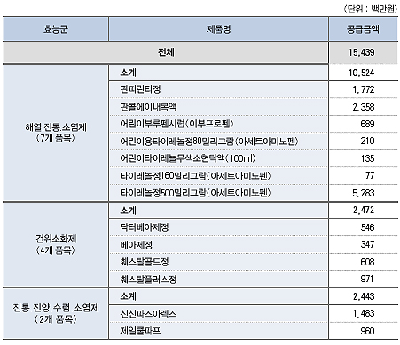 효능군별로는 해열진통소염제(7품목) 105억2400억원, 건위소화제(4품목) 24억7200억, 진통·진양·수렴·소염제(2품목) 24억4300억이 공급된 것으로 집계됐다.