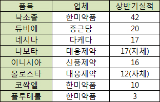 한편 대웅이 야심차게 발매했던 고혈압복합제 올로스타(자체 실적 12억)와 한미약품이 주력하고 있는 세레타이드 제네릭 플루테롤(처방실적 3억) 등은 하반기 행보를 지켜봐야 할 것으로 보인다.