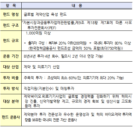 글로벌 제약산업 육성펀드는 국내 제약·바이오·의료기기산업의 해외진출과 신약개발 역량 제고, 규모의 경제 확보 및 생산시설 고도화 등 산업 경쟁력을 강화하는 목적으로 추진되고 있다.