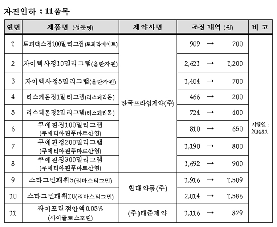 아울러 기등재의약품 11개 품목은 제약사 요청에 의해 조정된다.