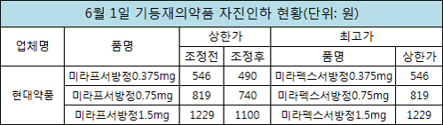 자진인하된 기등재 의약품도 있었다. 현대약품은 오리지널인 미라펙스서방정과 상한가가 같은 미라프서방정 3개 함량의 약값을 각각 10% 가량 자진인하했다.