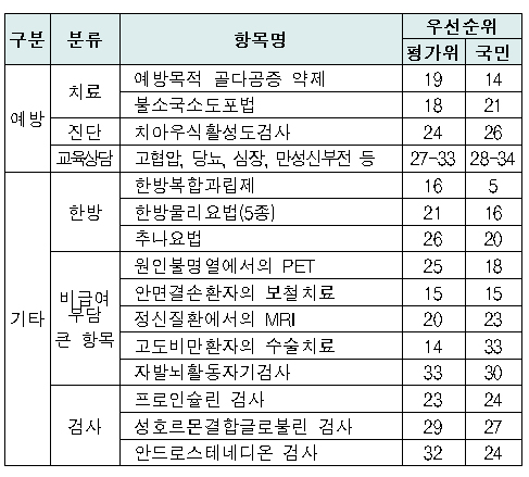 반면 만성질환 상담료 신설 등 예방의료서비스에 대해서는 우선순위 평가에서 낮은 점수를 매겼다.