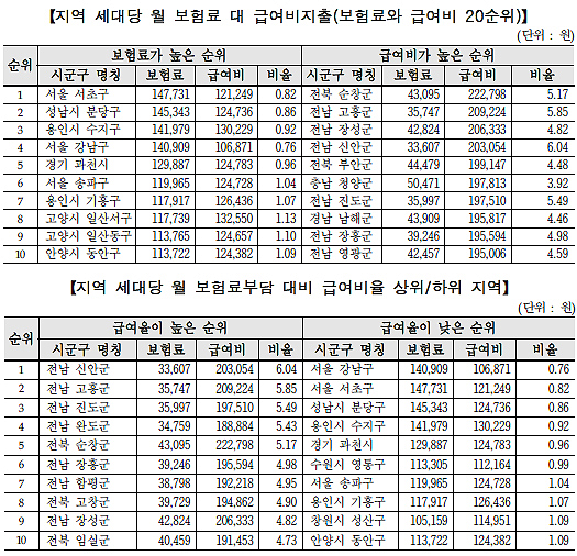 전남 고흥군과 장성군도 각각 3만5747원과 4만2824원을 납부하고 20만9224원, 20만6333원 가량의 혜택을 봐 4.82~5.85배씩 더 급여 혜택을 입었다.