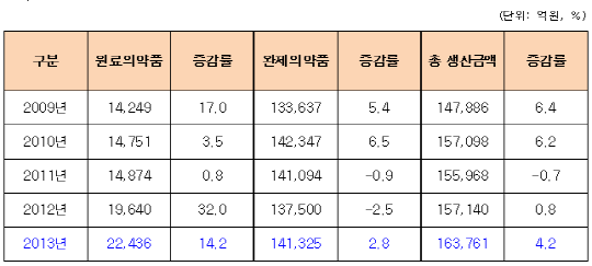 원료의약품도 지난해 2조2436억원으로 2012년보다 14.2%나 증가했다. 완제의약품은 14조1325억원으로 전년보다 2.8% 늘어나는 데 그쳤다.