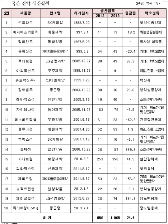 이와 함께 20개 신약 중 16개 신약이 1065억원 어치가 생산됐다. 생산실적 조사 후 처음으로 1000억원을 넘어선 것이다.
