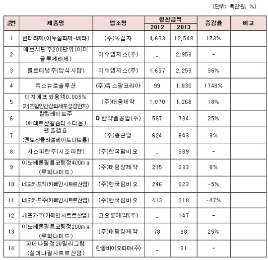 15일 식약처는 2013년 국내 의약품 생산실적을 공개했다.