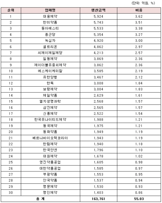 그 동안 1위였던 동아제약의 경우 동아에스티와 동아제약으로 분할돼 순위는 하락했으나, 이 두 기업의 생산액을 더하면 총액이 6004억원으로 대웅제약보다 앞섰다. 상위 10개사 대부분은 생산액이 증가했으며 특히 에스케이케미칼(24.5%), 셀트리온(13.3%), 제이더블유중외제약(11.8%), 녹십자(11.7%) 등이 두 자리수 이상 성장했다.