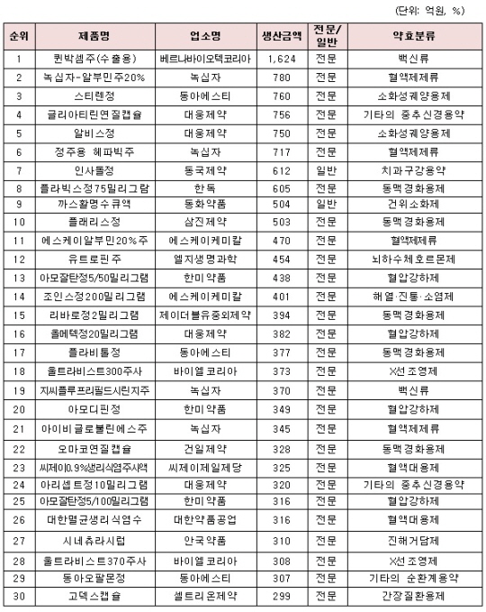국내 의약품 생산실적 16조 돌파…1위 '퀸박셈' 수성