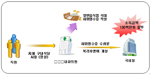 이에 국세청은 업종 특성상 모든 직원이 구내식당을 사용할 수 밖에 없는 환경으로 일반 음식점에서 허위로 소액 식대 영수증으로 발급받아 계상한 복리후생비 1억600만원에 대한 소득세를 추징했다.