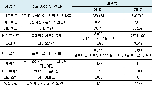 이같은 성과를 바탕으로 바이오사업 매출이 2012년 96억원에서 2013년 110억원으로 늘어났다.