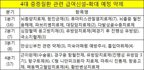 또 4분기 급여확대 대상에는 근이완제(수술용), 경구용 항혈전제, 항구토제, 항응고제, 폐동맥고혈압치료제, 황반변성치료제 등이 포함됐다.