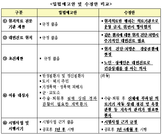 의료법개정안은 이미 지난해 당정협의를 통해 한 차례 손질이 이뤄졌었다. 원격의료 전문기관 금지, 대면진료 원칙, 초진제한, 이용 대상자 축소, 시범사업 및 시행시기 조정 등이 그것이다.