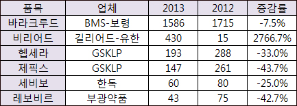 업계 관계자는 "지난해 리딩품목 바라크루드 처방 감소액은 상당부문 비리어드로 이동한 것으로 추정된다"며 "올해도 이같은 양상은 이어질 것"이라고 진단했다.