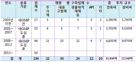 다행히 국내 많은 제약사들은 지난 10여년 간 진행된 GMP선진화 프로젝트에 의해 GMP 시설의 하드웨어 분야는 어느 정도 글로벌 GMP에서 요구하는 규정을 충족하게 되었다. 최근 10여년 간 국내 제약사들은 자그마치 3조원 정도를 새로운 GMP시설 현대화에 쏟아 부었다. 아래의 도표는 그간 GMP 플랜트 구축에 투자한 내역을 보여주고 있다.