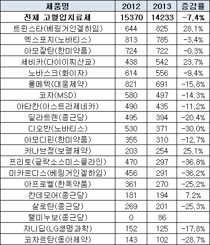 반면 엑스포지는 제네릭 등장에 마이너스 성장을 기록했지만, 하락률은 3.4%에 그쳤다. 제네릭 등장에도 약가인하가 되지 않은 것이 주효했다. 아모잘탄 역시 전년도와 비슷한 처방액을 보이며 3위 자리를 굳건히 했다.