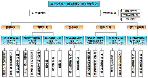 사업은 크게 ▲경영합리화 ▲재정누수클린업 ▲흡연피해구제 ▲부과체계개선 ▲맞춤형예방서비스 ▲보장성강화 ▲장기요양제도발전을 주제로 한 7개 추진단과 외부전문가 그룹인 자문위원회를 설치해 운영할 계획이다.