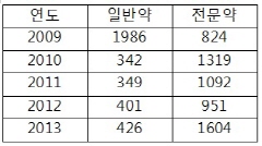 2013년 전문약 허가는 전년 대비 무려 70% 가량 늘어난 1604건이었다. 증가한 건수로 보면 650건에 달한다.