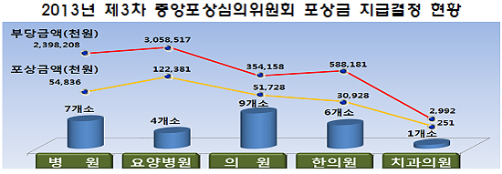 17일 공단에서 열린 '2013년도 3차 중앙포상심의위원회'에서도 최근 4개월 간 병의원 내부 공익신고자들의 조력으로 거짓·부당청구를 확인한 액수만 64억205만원으로 나타났다.