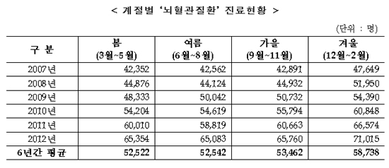 뇌혈관질환은 계절과도 관련이 있었다. 연도별 환자추이를 봤더니 연중 기온이 가장 낮은 겨울철(12월~2월)에 진료환자가 다른 계절보다 더 많았다.