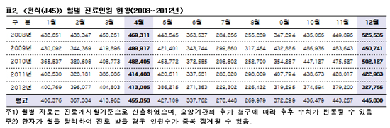 실제 진료인원은 2008년 239만명에서 2009년 244만명으로 늘었다가 2010년과 2011년에는 각각 230만명으로 비슷한 수준을 유지했다. 지난해에는 217만명으로 더 줄었다.