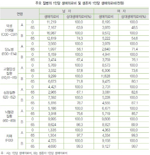 암 중에서는 남성은 폐암·결장암·위암·간암 순, 여성은 유방암·결장암·폐암·위암 순으로 지출이 많았다.