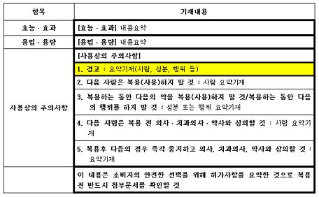 또 첩부제 등 피부에 점착하는 품목은 탈·부착 등 안전사용방법을 안내하는 문구를 기재하도록 권장하고, 사용상 주의사항의 경고항은 배경을 노란색으로 표시할 수 있게 된다.