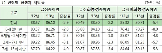 하지만 여전히 급성비화농성중이염, 급성중이염 구분 없이 전반적으로 높게 나타났다. 요양기관 규모별로 상급종합병원 50.2%, 병원 85.8%, 의원 86.5%로 종별규모가 작을수록 항생제 처방률이 더 높았다. 항생제 처방률이 가장 높은 연령구간은 6개월~2세미만으로 86.7%이고 가장 크게 감소한 연령구간은 7~15세미만으로 전년대비 4.0%감소한 84.2%였다.