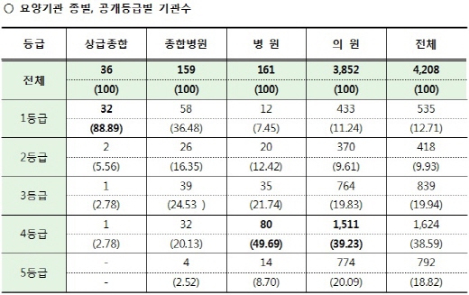 평가등급이 공개되는 요양기관은 해당코드 청구건수가 30건 이상인 4208곳이다. 종별로는 상급종합병원 36곳, 종합병원 159곳, 병원 161곳, 의원 3852곳 등으로 분포했다.