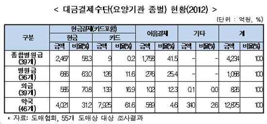 실제 종합병원급은 약품대금의 58.3%는 현금으로, 41.5%는 어음으로 결제하고 있었다. 카드는 0.2%로 거의 사용하지 않았다.