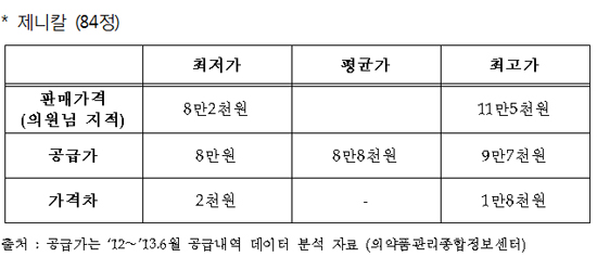제니칼은 격차가 더 심했다. 2012년부터 올해 6월까지 공급내역 데이터를 봤더니 최저가는 8만2000원, 최고가는 11만5000원으로 3만3000원 차이가 났다.