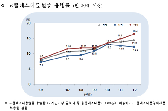 국내 성인 이상지혈증 환자가 꾸준히 증가하고 있는 것으로 나타났다. 고혈압도 소폭 증가하는 경향을 보였다. 반면 당뇨는 유병률이 줄고 있었다.