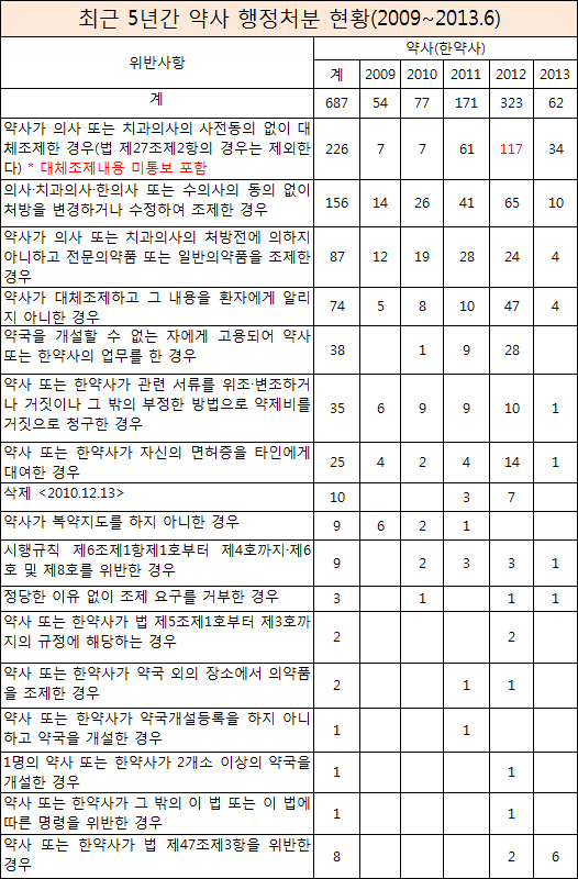 약사는 같은 기간 687명이 행정처분을 받았다. 연도별로는 2009년 54명, 2010년 77명, 2011년 171명, 2012년 323명, 2013년 62명 등으로 분포했다.