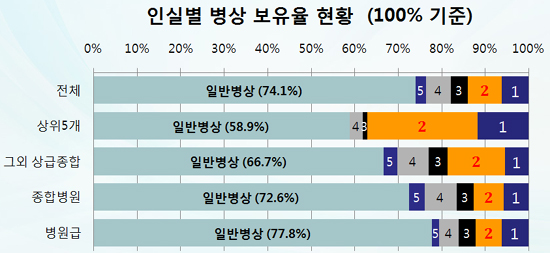 또 수도권 대형병원 환자쏠림 현상이나 장기 입원환자의 일반병상 점유율이 높고, 상급종합병원이 경중환자를 과도하게 진료한 것도 원치않는 상급병실 이용문제를 낳고 있다.