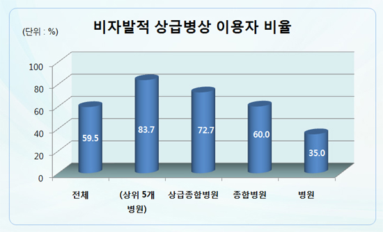이런 상급병실제도는 어떤 문제점을 낳고 있을까? 설문조사 결과 상급병실 이용환자의 59.5%가 비자발적으로 상급병상을 이용하고 있었다. 비자발적 상급병실 이용자 비율은 역시 상위 병원으로 갈수록 상승했다.