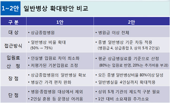 두번째 안은 현재 6인실인 일반병상 기준을 종별로 4~2인실까지 확대해 종합병원과 병원급은 4인실, 상급종합병원은 3인실, 상위 5개 병원은 2인실로 기준을 변경하는 게 골자다.