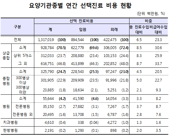 상급병실료 규모 1조147억, 선택진료비 1조3170억