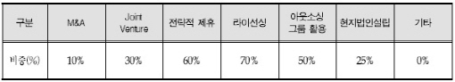 또 아웃소싱 그룹 활용 50%, 조인트벤처 30%, 현지법인설립 25%, M&A 10% 순이었다.