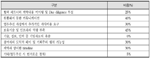 원활하지 못한 커뮤니케이션·업무추진과정에서 추가적인 과다비용 요구가 각각 40%, 계약과 상이한 타임라인과 참여자의 도덕적 해이가 30%였다.