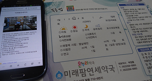 봉투 상단에 있는 약국 QR코드를 휴대폰으로 찍어보면 약국의 위치와 내외부 모습, 조제실 모습 등의 사진과 함께 약사가 직접 기재한 약국 소개 글도 확인이 가능하도록 해 놓았다.