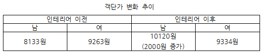 객단가를 비교해보자. 공사 이전 남성고객 객단가는 8133원, 여성고객은 9263원이었다.